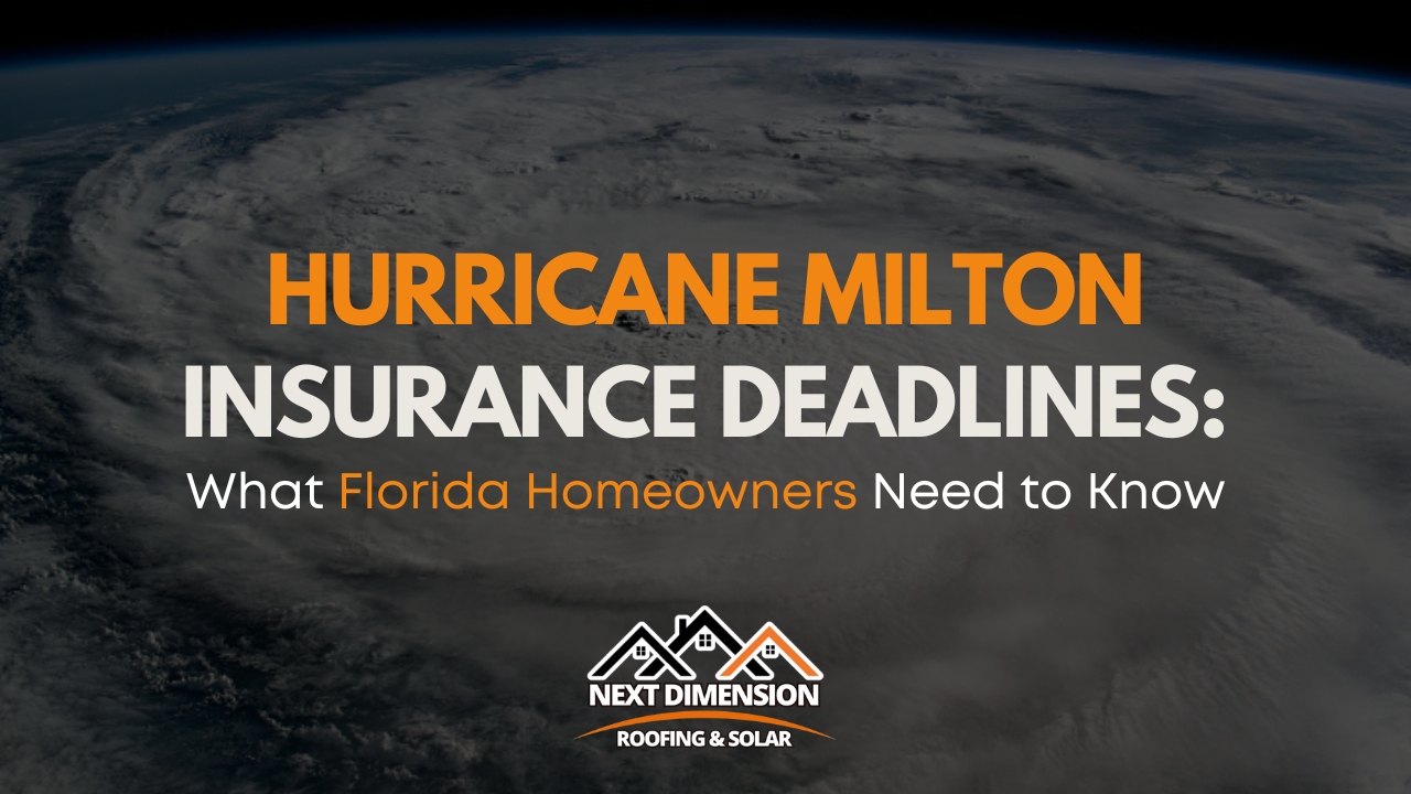 The clock is ticking. For Hurricane Milton, Florida homeowners have until October 9, 2025 to file initial property damage claims. Don’t wait until next fall to find out if your roof was compromised — by then, it may be too late. Exploring roof repairs? Considering a complete roof replacement? Call or visit us online to schedule your free roof evaluation with a Next Dimension expert today.